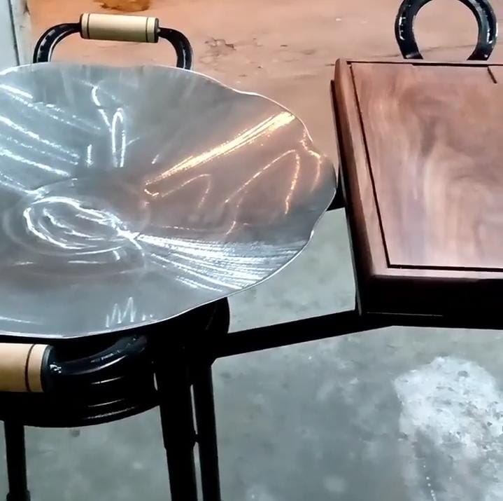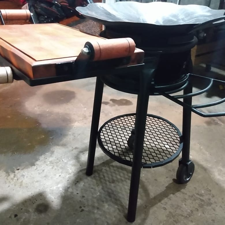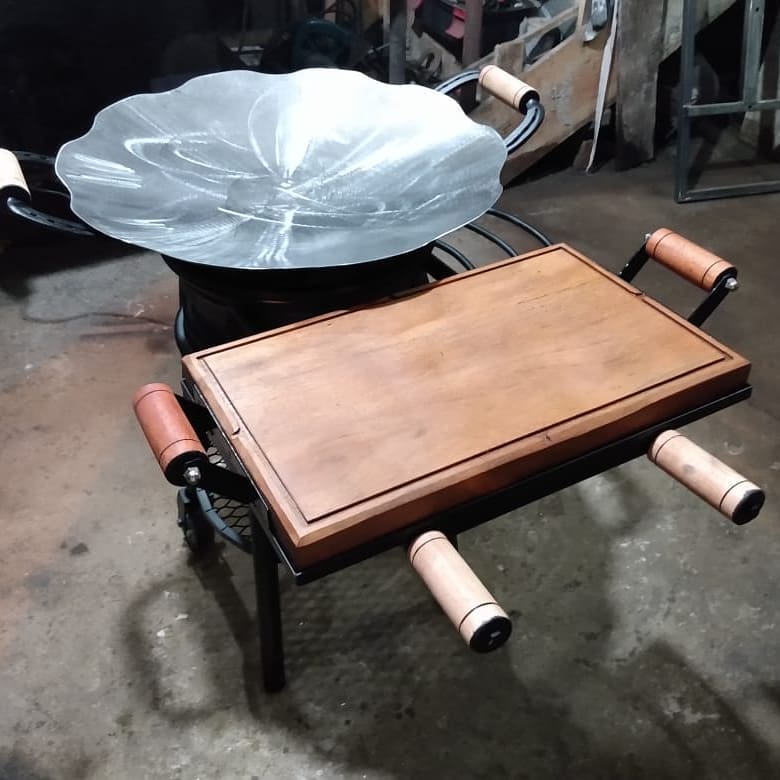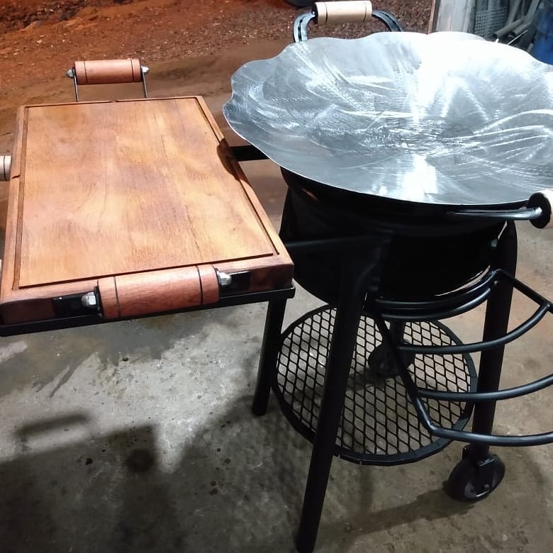 O tacho é feito em aço carbono de alta resistência, com 77cm de diâmetro, ideal para preparo em fogo alto. Acompanha suporte a gás com queimador industrial, estrutura firme e de longa durabilidade. A tábua é fabricada em madeira de carvalho tratada, robusta, resistente e perfeita para cortes pesados ou servir porções com estilo.