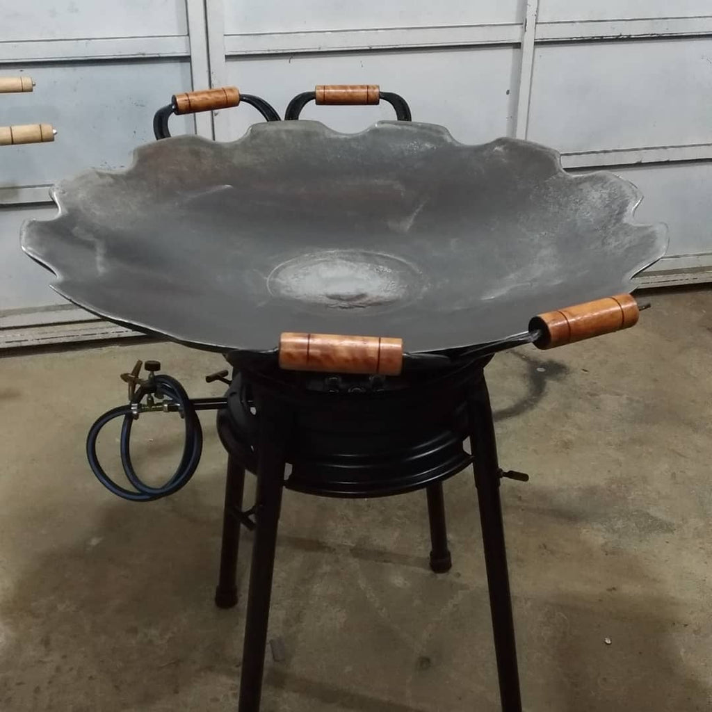 O tacho é construído em aço carbono extra reforçado, com espessura ideal para suportar altas temperaturas e uso intenso. Possui design robusto com 2 alças de ferradura de cavalo. O suporte a gás é feito em ferro fundido industrial, com queimador potente e estrutura estável para preparo seguro.